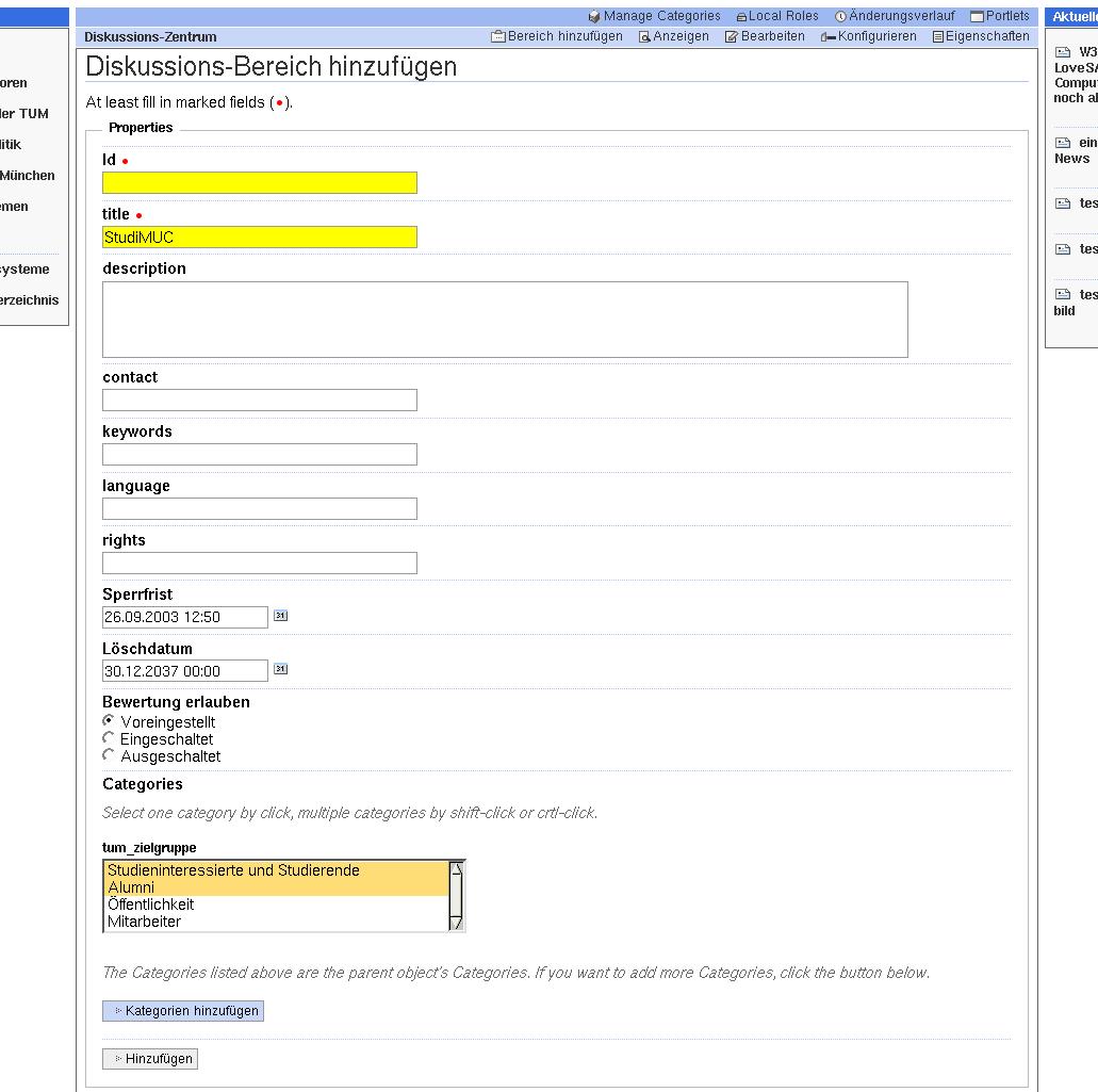 Es können aus allen Kategorien Bereiche ausgewählt werden, müssen aber nicht. Als Defaultwert ist dann immer alles eingetragen bzw. ist nicht notwendig (z.B. bei Discussionboard ist Kategorie tum_veranstaltungstyp nicht relevant, d.h. wird nicht verwendet) - Wenn alles eingetragen ist, den hellgrauer Button 'Add DiscussionBoard' unten links innerhalb des Formularrahmens anklicken.