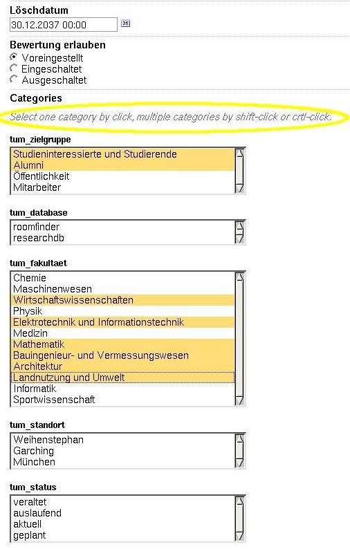 Bei Anklicken erscheint das gleiche Formular, das aber unten (scrollen!) um einige Categories erweitert ist. Hier werden die Kategorien eingetragen wie Fakultät, Standort, Studiengang, Mitarbeiter usw. Durch Anklicken mit der Maus wird eine Fakultät ausgewählt, bei mehreren mit 'shift' arbeiten, wenn einzelne Fakultäten, die ausgewählt werden sollen aber nicht untereinander stehen, mit 'Strg' arbeiten. (Abb. 3)