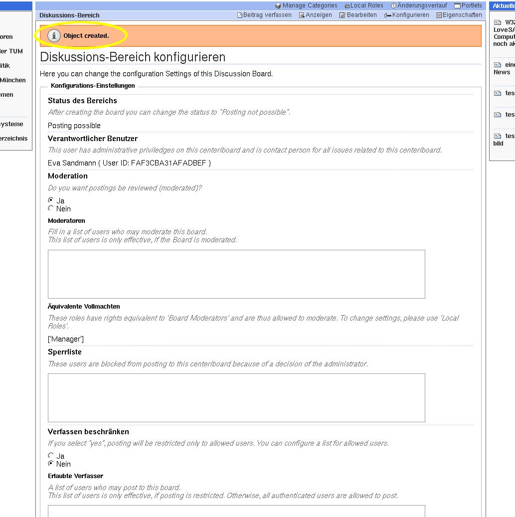 Mit diesem neuen Formular können weitere Konfigurationen des neu angelegten Discussionboards eingestellt werden.