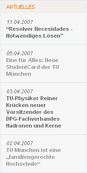 Ganz rechts auf der Portalseite ist die "Aktuelles"-Box zu sehen. Welche Inhalte unter "Aktuelles" aufgeführt werden hängt davon ab, welche Zielgruppe Sie eingestellt haben. Die Zielgruppe Öffentlichkeit bekommt die aktuellen Pressemitteilungen zu sehen, Studierende u.a. auch "News aus den Fakultäten".