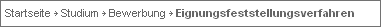 In diesem Fall befindet man sich im Ordner "Studium" im Unterordner "Bewerbung" auf der Seite Eignungsfeststellungsverfahren.