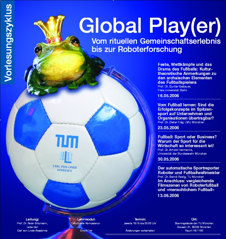 „Vom Fußball lernen: Sind die Erfolgskonzepte im Spitzensport auf Unternehmen und Organisationen übertragbar?“: Zu diesem Thema spricht im Rahmen der neuen Fußball-Vorlesungsreihe der Carl von Linde-Akademie der TU München (TUM) am 23. Mai 2006 Prof. Dieter Frey, Direktor des Departments Psychologie der LMU München.