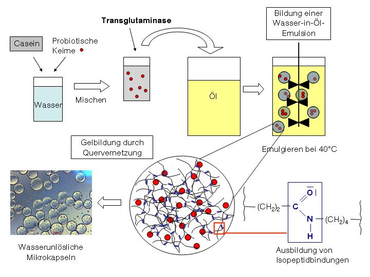 Als Material verwenden die Lebensmittelforscher das Milchprotein Casein, da es sich gut mit anderen Stoffen mischt und auch geschmacklich für den Einsatz in Milchprodukten geeignet ist. Außerdem gibt es bei diesem Naturstoff keine Probleme mit der Verbraucherakzeptanz beim Einsatz in Joghurt und Molkedrinks. Um das Casein in brauchbare Mikrokapseln zu verwandeln, nutzen die Forscher die Lebensmittelchemie: Zuerst mischen sie die probiotischen Keime mit dem Milcheiweiß, das als Hüllstoff dienen soll. Nach Zugabe des Enzyms Transglutaminase und der Herstellung einer Wasser-in-Öl-Emulsion bildet sich ein Casein-Gel, in dem die gesunden Bakterien von einem dichten Netz umschlossen sind (s. Abb. am Ende dieser Website).