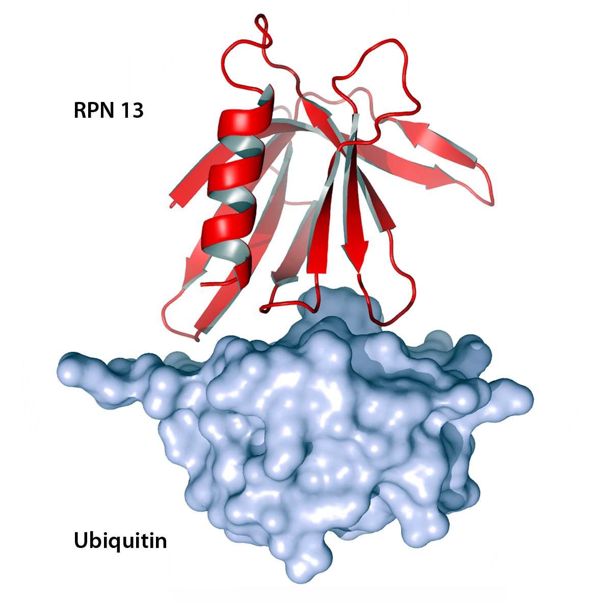 Das Proteasom ist ein aus 28 Untereinheiten aufgebauter, stabiler Zylinder. Eine Art Deckel verhindert, dass Proteine zufällig hinein geraten und zerstört werden. Ein Schleusensystem im Deckel erkennt als Abfall markierte Bausteine. Es spaltet die Ubiquitin-Markierung ab, faltet die verschlungene Eiweißkette auf und befördert sie in den Schredder. Den TUM-Wissenschaftlern ist es nun erstmals gelungen, die dreidimensionale Struktur von Rpn13 zu bestimmen, einer Schlüsselkomponente des Schleusensystems.